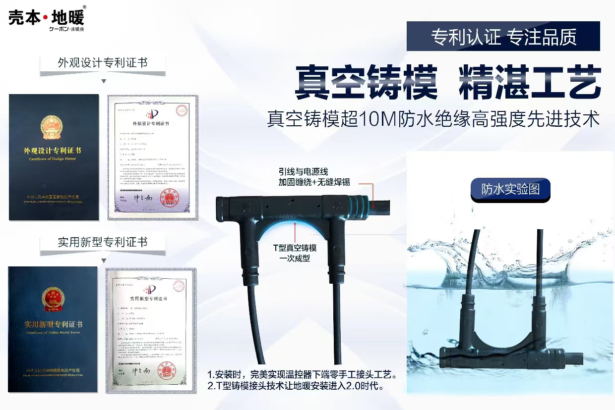 看碳纖維點(diǎn)地暖線纜的接頭。優(yōu)質(zhì)的碳纖維地暖線纜T型頭應(yīng)該使用真空鑄模工藝,一次成型,從而能保證系統(tǒng)適用地下隱蔽長期使用要求。目前高等級的接頭技術(shù)標(biāo)準(zhǔn)是真空鑄模,真空注模技術(shù)利用高溫熔化液壓技術(shù),一次成型接頭,具有極好的防水防潮性能,可以直接在10米水深環(huán)境里工作。