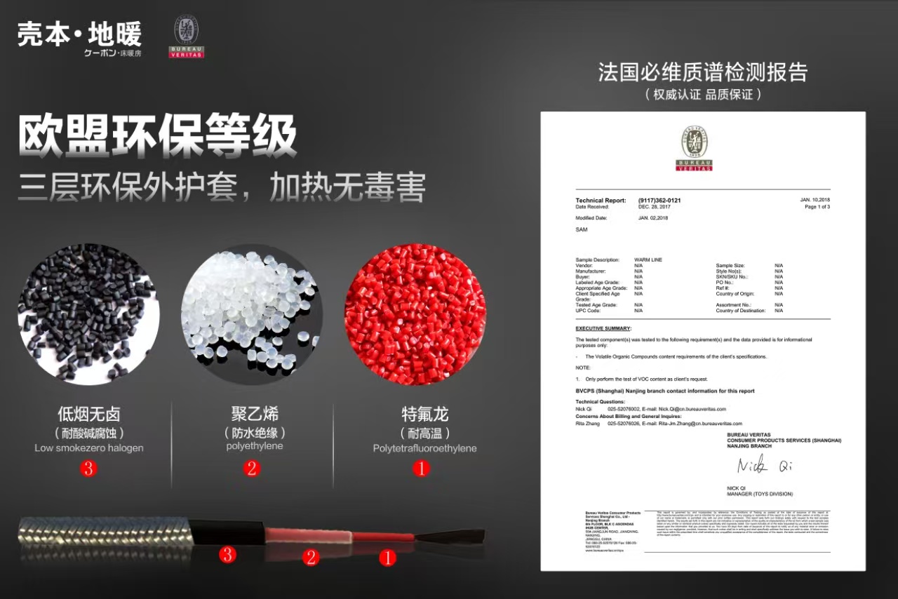 用打火機(jī)燒碳纖維電地暖線纜。燃燒時(shí)有黑色且刺鼻的黑煙,就說明外護(hù)套不環(huán)保,在加熱時(shí)會釋放有毒的氣體。這些有毒氣體將對家人健康帶來影響。